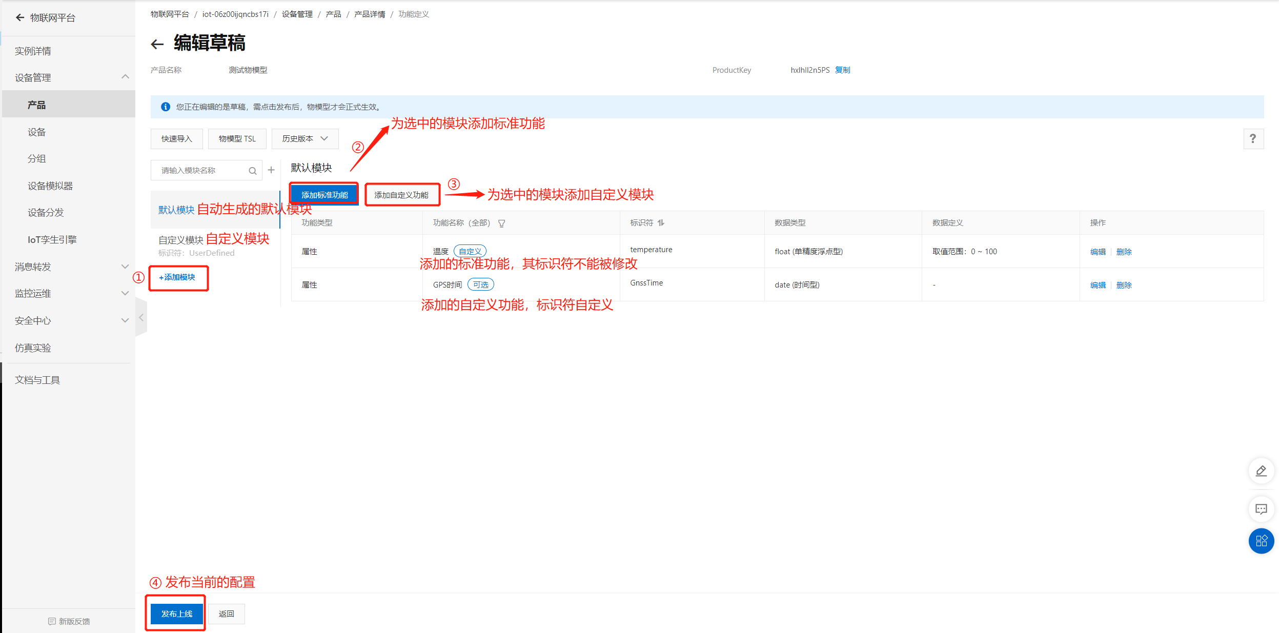 3.在【编辑草稿】界面,添加模块、标准功能、自定义功能,点击“发布上线”。