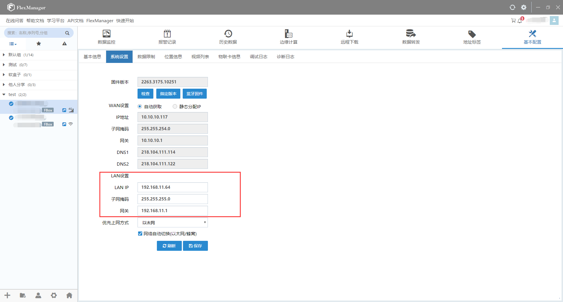 用户通过FlexManager上对FBox的联网方式、网络参数进行远程设置,请根据实际网络环境,设置FBox的联网方式(2G、4G、5G、WiFi、以太网等)及网络参数(WAN IP、LAN IP等)。